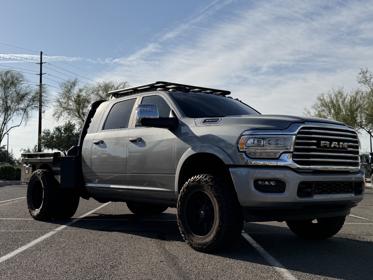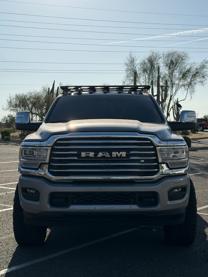 2024 ram 3500 limited longhorn megacab, 3” lift with bilstein shocks, carli torsion sway bar, 35” micki thompson MTs on 20” fuel wheels, rhino roof rack, crownline skirted flatbed, s&b 55g diesel tank